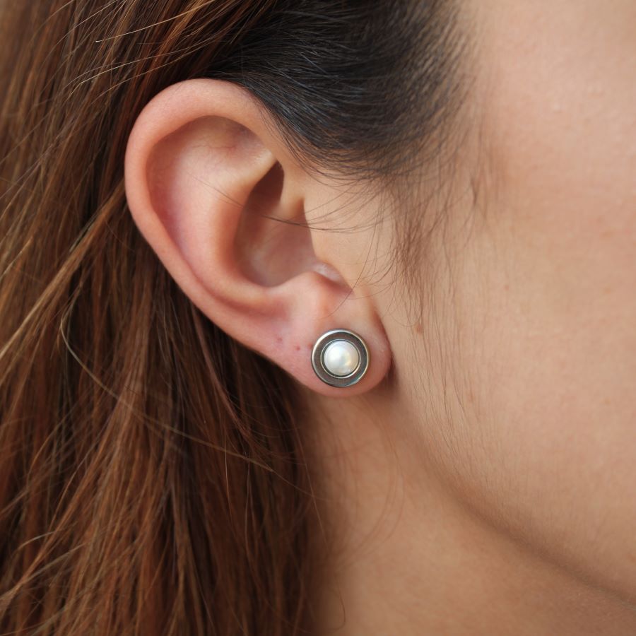Stainless steel earrings, round with pearl, gold or silver-plated, anti-allergy