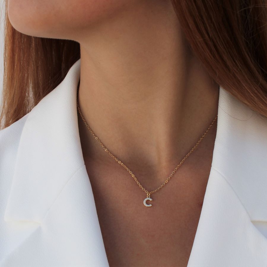 Gold or silver plated stainless steel necklace with rhodium-plated lettering and zirconia stones
