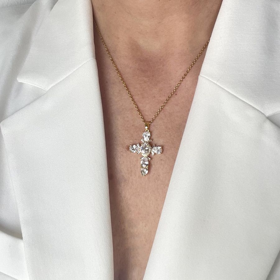 Colar em aço inoxidável dourado, crucifixo em ródio preto ou branco