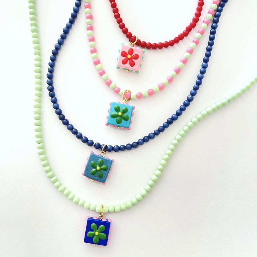 Colar missangas com fecho e extensor em aço inoxidavél com pendente quadrado com flôr