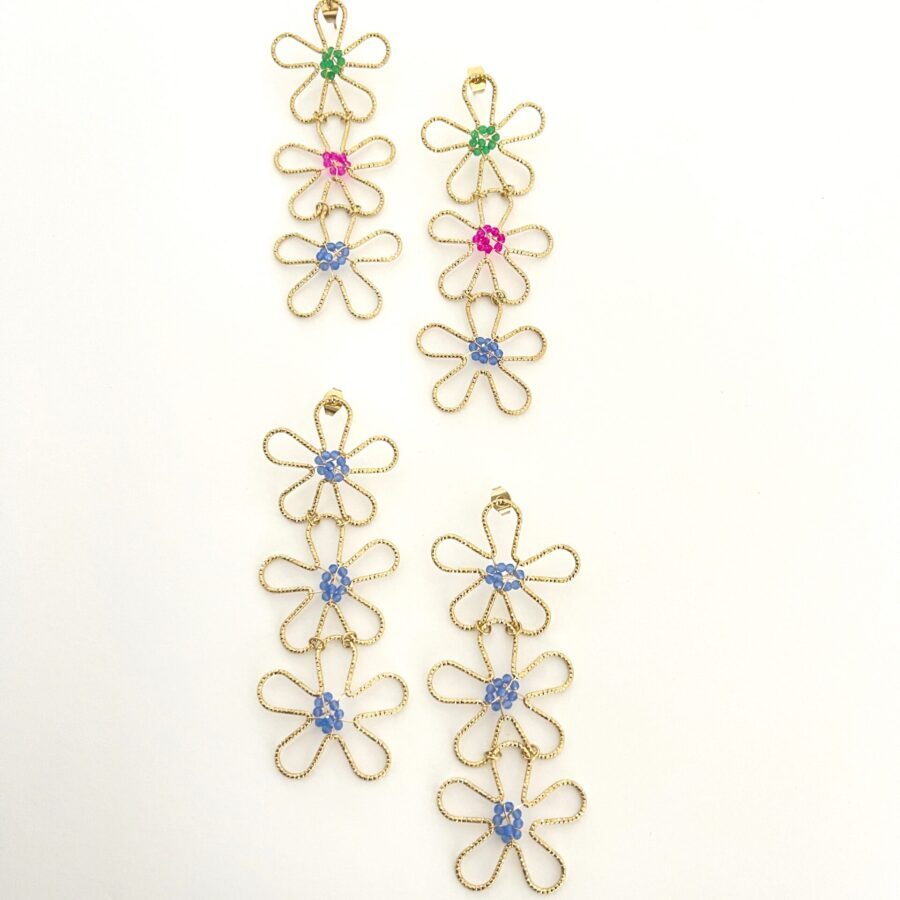 Brincos em aço inoxidável flôr em dourado com azul e multicolor