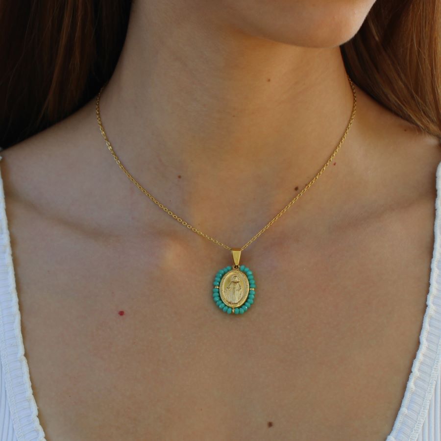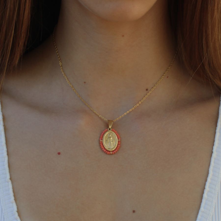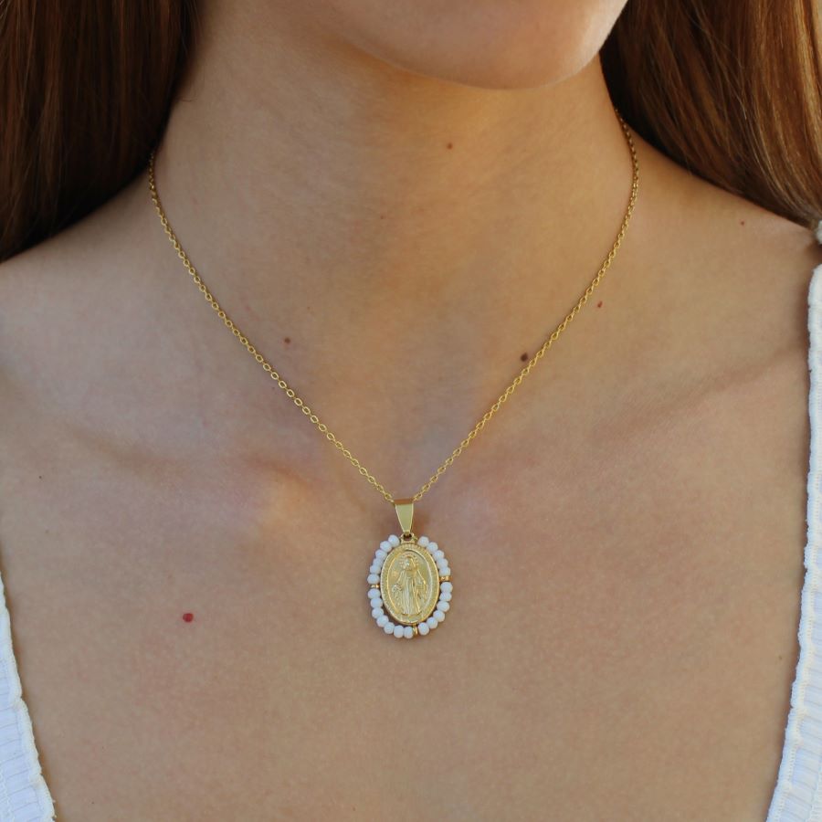 Colar Nossa Senhora em aço inoxidável dourado e missangas. Disponível em branco, laranja, preto, verde