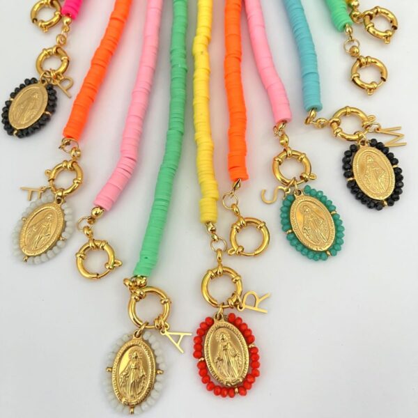 Colar em fimo com fecho em aço inoxidável dourado, pendente Nª Srª das Graças e letra em aço inoxidável