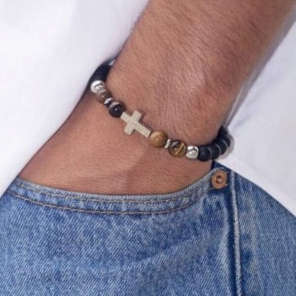 Pulseira elástica, pedra ónix e olho de tigre, crucifixo em aço inoxidável.
