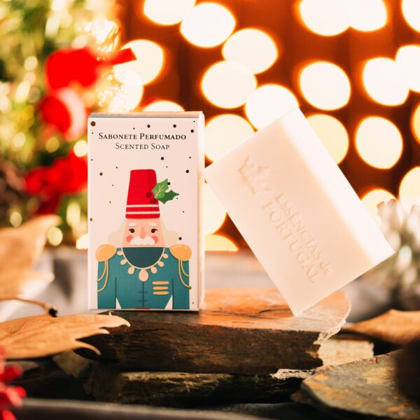 Diz-se que os quebra-nozes eram dados como lembranças para trazer sorte às famílias e proteger as suas casas. Neste Natal temos este fantástico sabonete de 150g, exclusivo, composto pela parte de cima e pela parte baixo do quebra-nozes na frente e nas costas da caixa respectivamente.